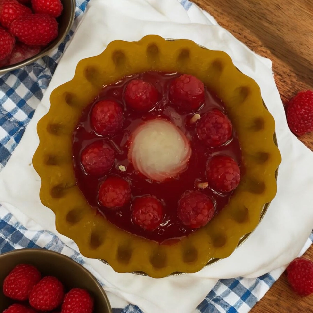 Handmade candle with a Paraffin/Soy Blend, gel wax, wax raspberries and a wax dollop. The pie contains three wicks in a pie pan. Each pie will come packaged in a pie box.